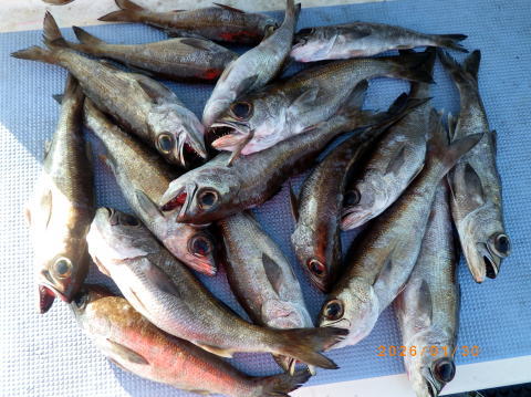 | Fサビキ五目好調!! フラッシャーサビキ五目のクロムツ~アマダイ五目のリレーへ出船。 Fサビキ五目のクロムツは、昨日とは違って型は良かったが ポツリポツリで良型交じって1~6匹 他にスミヤキ 良い外道は反応バリバリで食いも良かったが、 二枚潮きつく釣り難かった。平均サイズも良く お刺身サイズも交じって好調でした。 大型クーラー満タン。他にメダイ 後半のアマダイ五目は、1時間ほどで0~2匹 キダイ・ホウボウ。カイワリなど Fサビキ五目は、群れは濃いので潮次第で爆釣です。 明日20日(火)は、定休日です。 |