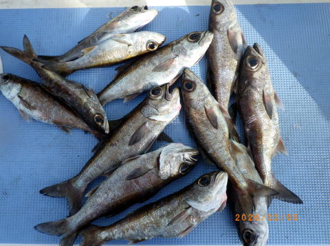 | フラッシャーサビキ五目~アマダイ五目のリレーへ出船。 Fサビキ五目のクロムツは、反応ありましたがなぜか食わなく 中小型顔見ただけで、良い外道へ切り替えました。 良い外道は、本日も反応はバリバリでした。 ゾロゾロ~もあり釣れましたが、水温が上がったからか? 端物が多く、追い食いさせてると底のサメにとられたり、 巻き上げ中にブリにとられてしまったりと うまくいかない方もいました。なぜかやられない方や 高速で巻いて端物かわしてた方はクーラー満タンに。 お刺身サイズも多く交じりました。 7キロのブリも1本逮捕しました。 後半のアマダイ五目は1時間でしたが、良型顔見て キダイ・ホウボウでした。 本日は極寒の中ありがとうございました。 雨・雪・みぞれ・雹と降るものは全部降りましたね。 明日は、道路状況次第・予報次第で出船します。 明後日は午前凪予報で出船確定です。 明日9日(月)は、Fサビキ五目~アマダイ五目のリレーへ出船予定。 御予約お待ちしています。 9日(月)、午前・募集中 10日(火)、午前・確定(空きあり) 11日(水)、午前・確定(ガラガラ) 12日(木)、午前・募集中 13日(金)、午前・募集中 14日(土)、午前・募集中 15日(日)、午前・確定(ガラガラ) Fサビキ五目(クロムツ)~アマダイ五目のリレー Fサビキ五目は、道糸PE4号最低300m 4号400m巻ける中型電動リールがおすすめ オモリ150号と200号用意 竿は2m前後のイカ竿や 150や200号に負けない竿 長すぎたり柔らかすぎるのはNG 仕掛けは、クロムツ専用オリジナルフラッシャーサビキを釣具屋さんより 安く販売していますので、わざわざ市販品を買って来ないで下さい。 仕掛けを売りたいのではなく、釣って頂きたいのでこちらをおすすめします! アマダイ五目は、オモリ80号 片天秤・クッションΦ1.5mm長さ30㎝ ハリス3号2本針の一般的なアマダイ仕掛け 付けエサはオキアミ 受付にて販売 針を飲まれることが多いので、長めのプライヤー必須 マダイは、プラカゴはFLサイズ限定になりました。 オモリは80号 ハリス4号6~8m 伊勢尼11号くらい基準で。 小さい針は駄目です。 クッションΦ1.5mm長さ50㎝ |